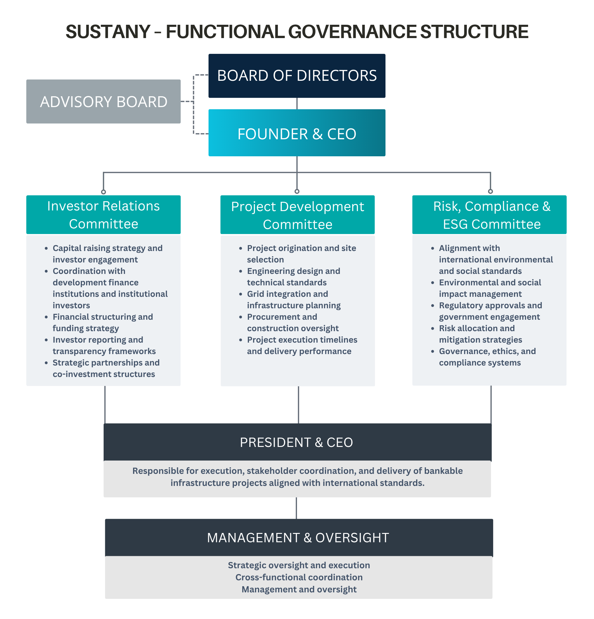 Through a network of senior strategic advisors, Sustany leverages deep expertise across infrastructure, finance, legal, and policy, reinforcing institutional alignment, enhancing strategic decision-making, and supporting the development of bankable projects across emerging markets.